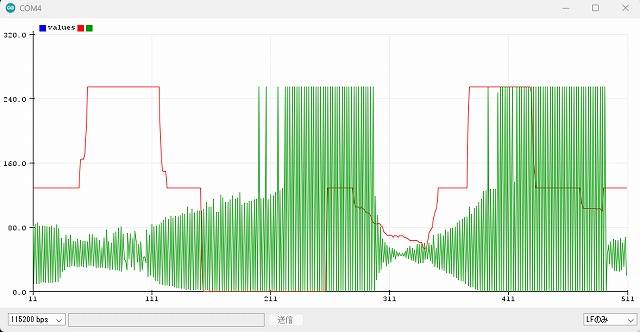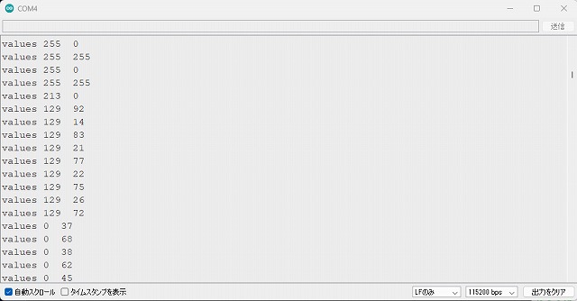 micro_rc_fpv_car_esp-now 2026.04.03 ESP32 でリモコンカーのコードをダウンロードしてテストしてみました。 受信機ESP32にスケッチ書き込み、送信機ESP32に受信機ESP32のMAC_Addressを追加したスケッチを書き込み。デュアルDCモータードライブ・サーボモーターが無いので動作は確認できませんが、シリアルモニター・シリアルプロッターで確認してみました。 シリアルモニター シリアルプロッター ジョイスティックを動かすと数値が変動しますので動作しているようです。